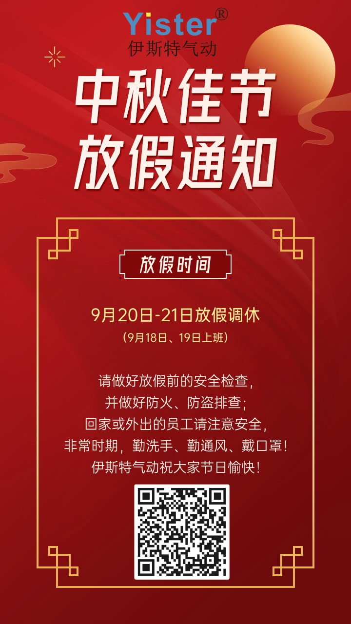 伊斯特氣動祝合作伙伴和全體員工節日快樂! 2021 年中秋佳節即將來臨,根據國家法定假期規定,并結合公司實際情況, 放假時間安排為:2021年9月20日至9月21日,共2天。2021年9月22日(星期三)正常上班。 在放假期間給您造成的不便,敬請諒解! 感謝廣大客戶朋友們一直以來對公司的大力支持與配合,在此借中秋節即將來臨之際,提前預祝大家中秋節快樂,闔家團圓,非常時期注意安全!